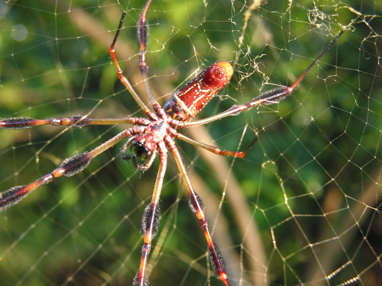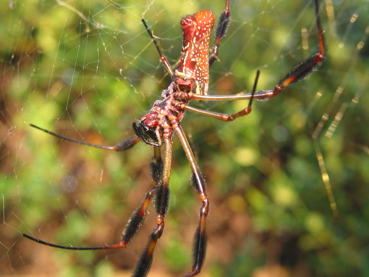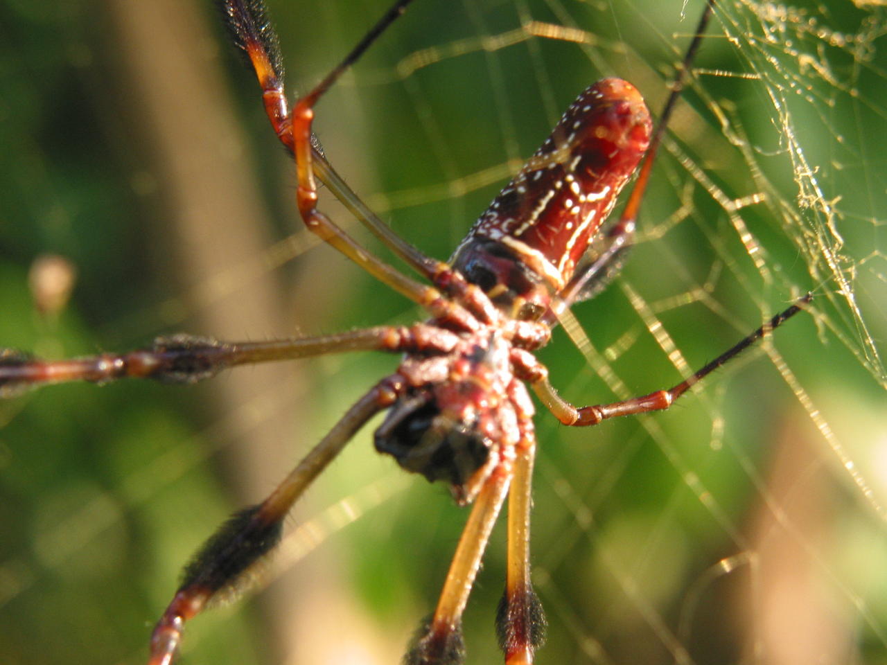 Natures way with Nephila clauipes (golden silk orb weaver). BTW it gets its name from the gold color of the web when the sun hits it. Also known as the Banana Spider. This is the female.