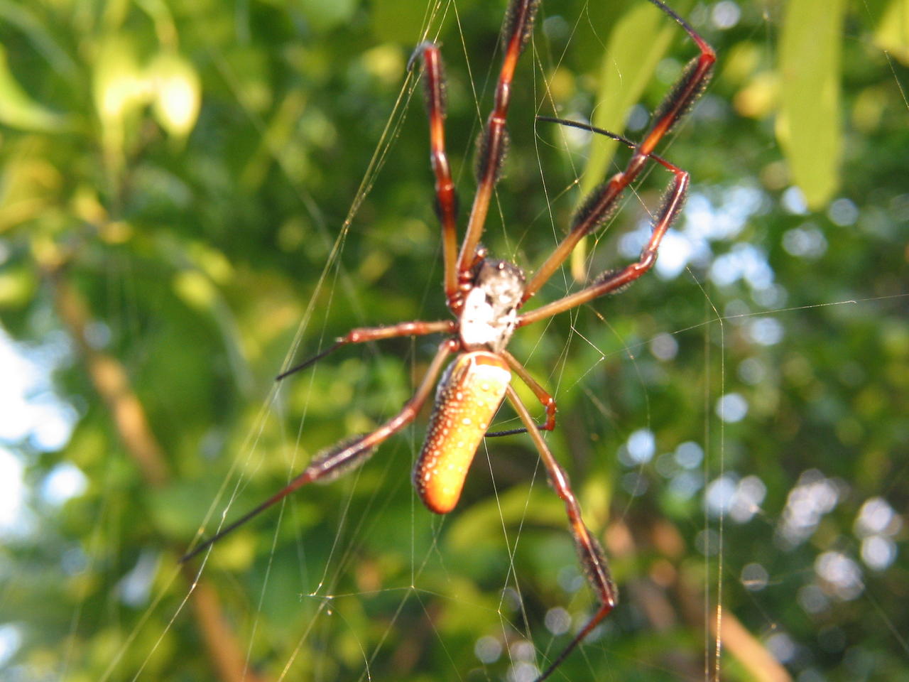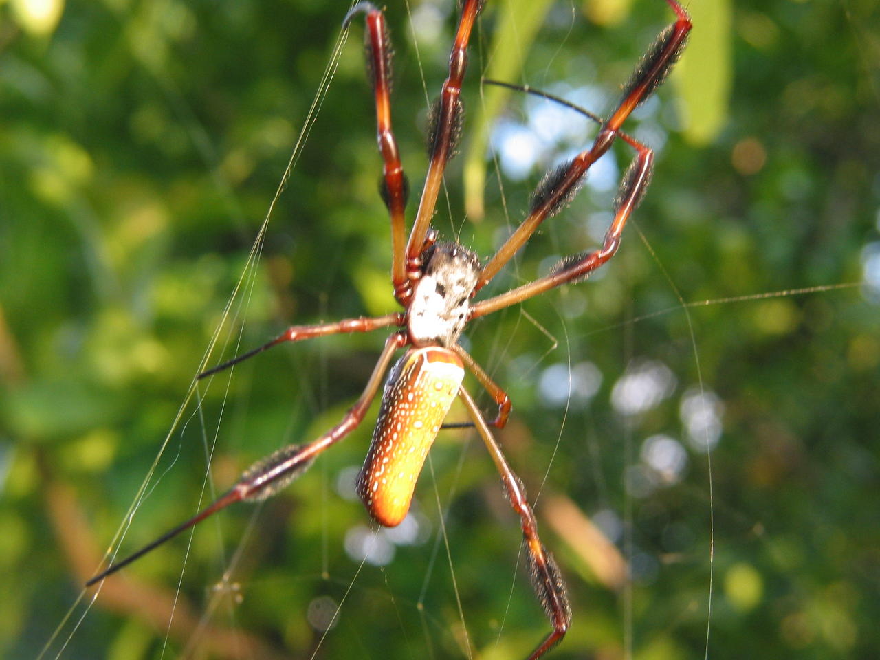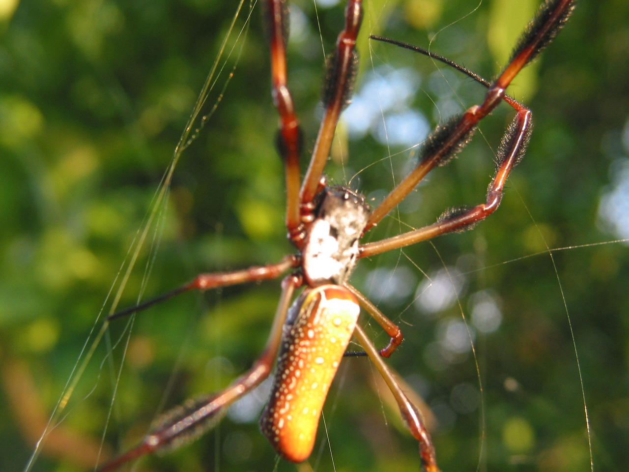 Natures way with Nephila clauipes (golden silk orb weaver). BTW it gets its name from the gold color of the web when the sun hits it. Also known as the Banana Spider. This is the female.