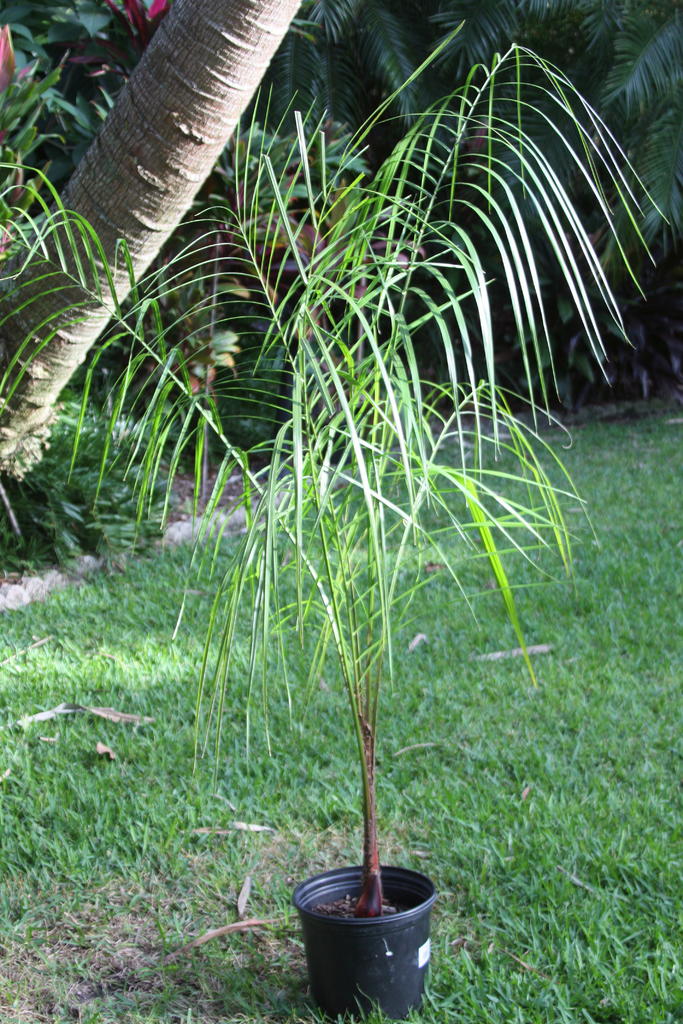 Here is a 2yr old Hybrid. The recipe here was using pollen from my reverse (S.rom X Butia) "Mule" back to the S.rom. Only had 7 seed to set and only one to germinate. I only left a dozen female flowers on the flower stalk as I am not fond of working at the height took to do this cross. I hope it turns out, as a lot of work to do this one. Looks a awful lot like a Queen palm except for the red leaf base.