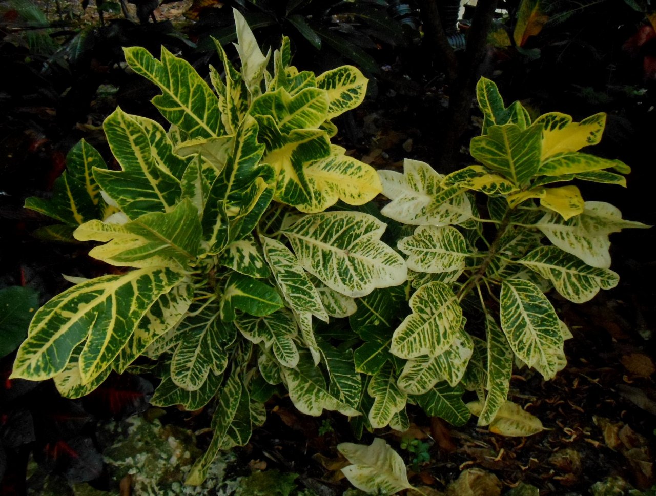When George Zammas saw this plant, he imediately without any hesitation ID it as Harvest Moon. Said it is a green and yellow croton that relishes the shade. The older leaves become white if grown in the shade.