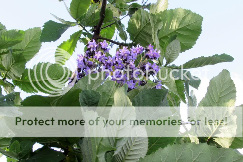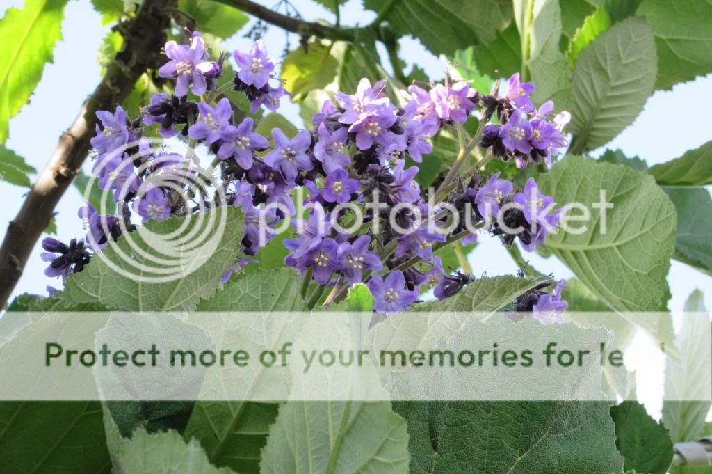 Wigandia urens is related to the Campanula's..has beautiful blue flowers like the temperate little perennial. It also has been called something like Malo Madre- lol- in South America because some clones,strains, have a wickedly powerful sting. The leaves are covered in hairs. I understand that most of Florida gardens have the stinging Wigandia. Now,somehow for whatever reason,the BBC clone has no sting. So,its safe and no more prickly then a Zucchini leaf. EXCEPT,I learned when you prune and leave cuttings to dry. Come back a few days later and grab with bare hands? WOW..then its like hypodermic needles. I didn't get any rash though,something that the South American and Florida clones also can deliver. You couldn't lift up a Wigandia dried stem bare handed. Impossible.