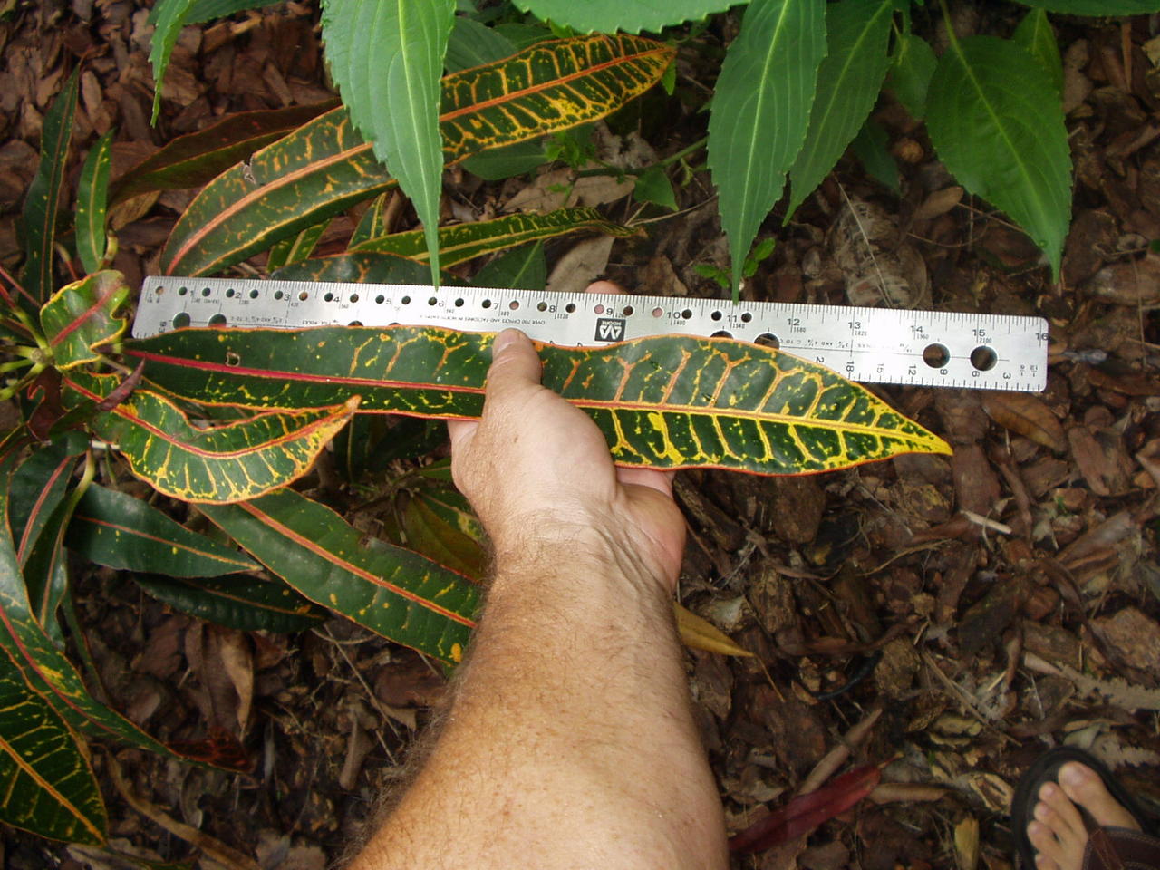 Here's the plant I got from Jeff in the first three pictures. Notice how the new growth comes out with a red midvein. Also look at the size of the mature leaves. All of them are well over a foot long, not including the petiole. Next are two shots of Pride of Winter Haven. The midvein starts out white and eventually becomes red. The leaves are rarely over 10" long. Both of them get a few hours of direct sun, the first one in the late afternoon - setting sun, and the other midday, but only at this time of the year. The unknown is in shade most of the day. Dappled sun for a few hours at midday, which may account for the size of the leaves but not the prominent red midvein.
